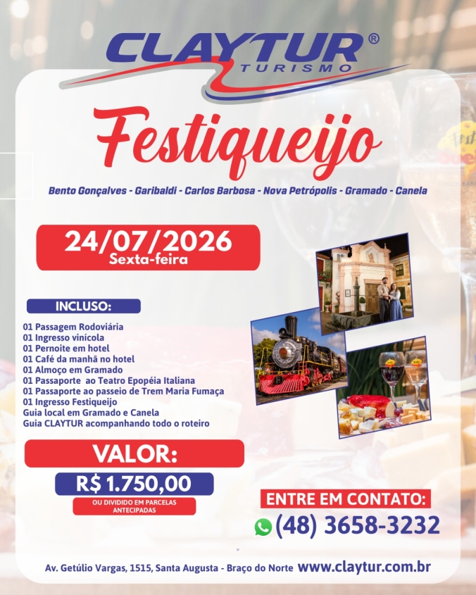 No dia 24/07/2026 (sexta-feira), embarque com a Claytur Turismo para o tradicional Festiqueijo, passando por Bento Gonçalves, Garibaldi, Carlos Barbosa, Nova Petrópolis, Gramado e Canela.